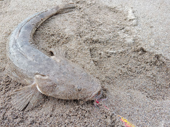 午後3時半くらいに釣れたマゴチという魚。見た目はアレですが美味!